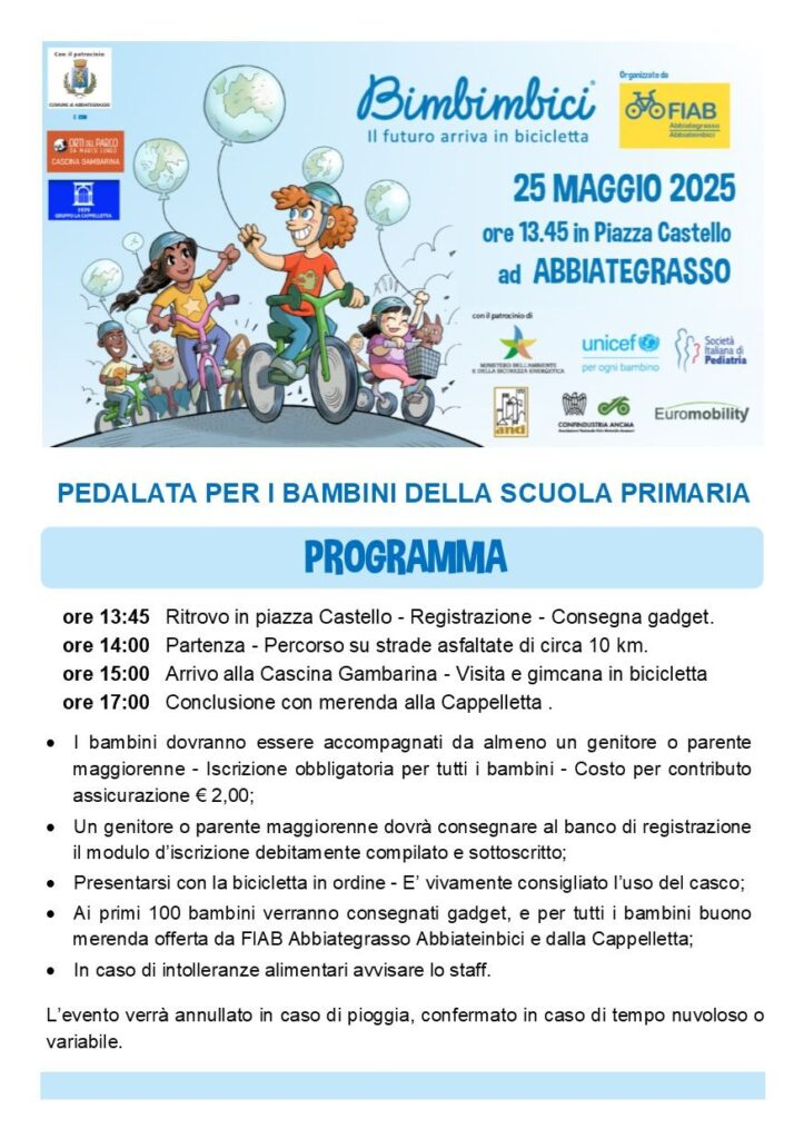 Bimbimbici è una manifestazione nazionale di FIAB che vuole promuovere la mobilità attiva e diffondere l’uso della bicicletta tra giovani e giovanissimi. Si svolge in tantissime piazze di tutta Italia e ad Abbiategrasso Domenica 25 maggio 2025 in piazza Castello alle 13,45.